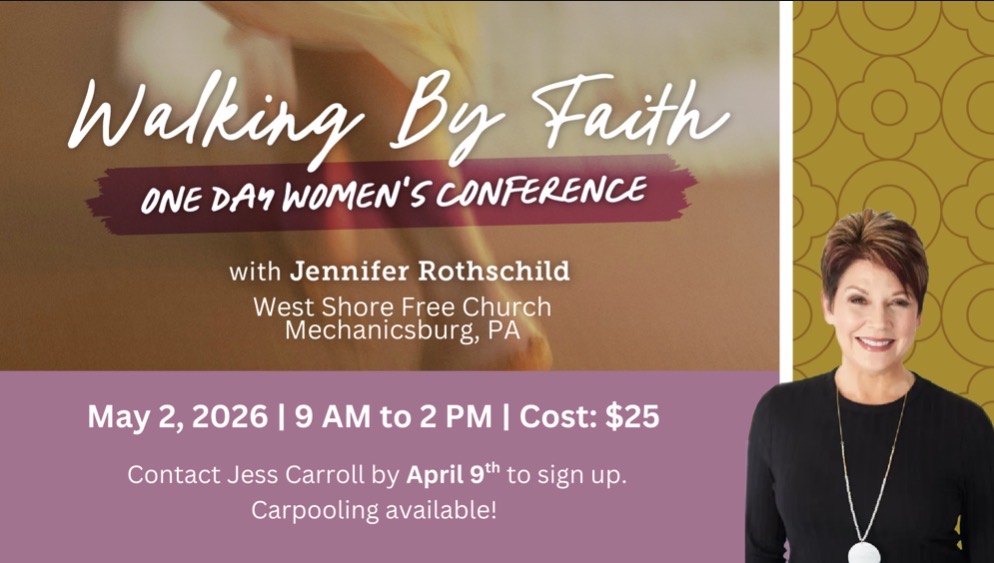 Come and hear from Jennifer Rothschild at this one-day, Walking by Faith conference on May 2, 2026, from 9:00am-2:00pm at West Shore Free Church in Mechanicsburg.